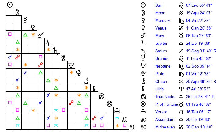Moon | 19 Aquarius 19 | 29 Libra 21 | 20 Cancer 3 |