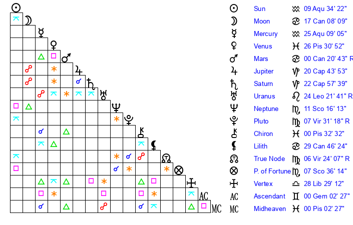 | Mercury | 25 Aquarius 9 | 2 Aquarius 36 | 19 Pisces 38 |