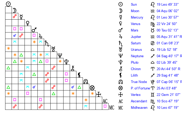 | Neptune | 4 Sagittarius 39 | 1 Aries 46 | 5 Sagittarius 16 |