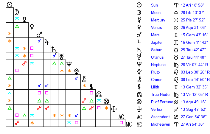 | Sun | 12 Aries 19 | 13 Aries 12 | 2 Cancer 32 |