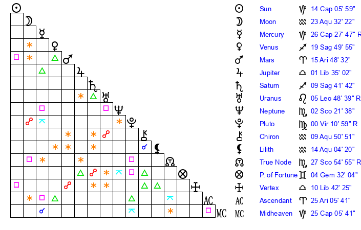 | Sun | 14 Capricorn 5 | 14 Capricorn 21 | 23 Pisces 51 |