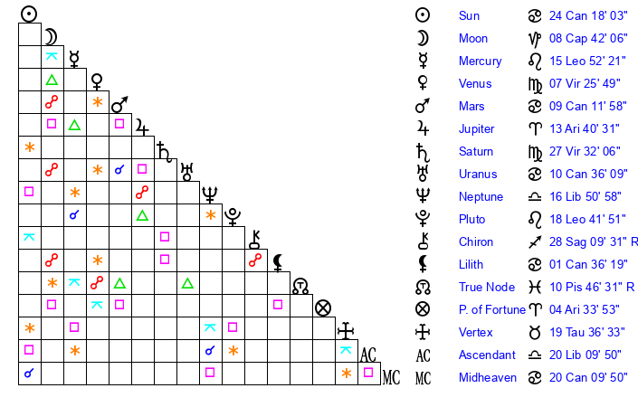 | Moon | 8 Capricorn 42 | 21 Aries 6 | 19 Virgo 6 |