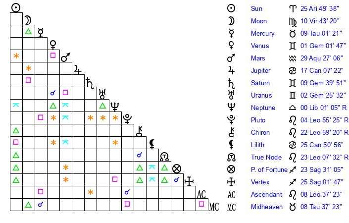 | Moon | 10 Virgo 40 | 7 Sagittarius 6 | 10 Virgo 57 |