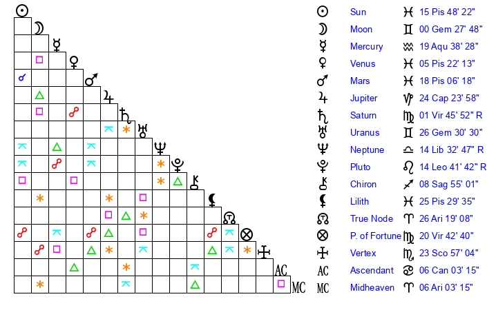 | Moon | 0 Gemini 23 | 16 Gemini 40 | 21 Pisces 6 |