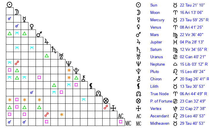 | Moon | 16 Aries 7 | 4 Sagittarius 13 | 14 Capricorn 35 |