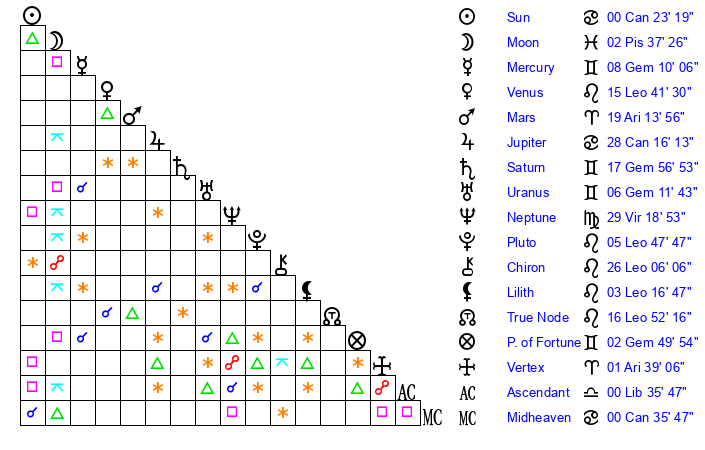 | Sun | 0 Cancer 23 | 1 Cancer 31 | 19 Virgo 3 |