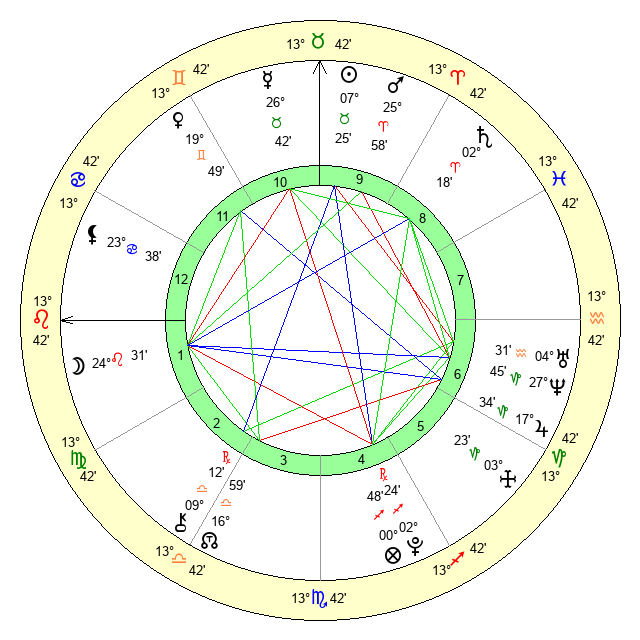 | Moon | 24 Leo 25 | 1 Taurus 48 | 14 Virgo 32 |