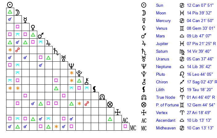 | Sun | 12 Cancer 8 | 12 Cancer 58 | 24 Virgo 13 |