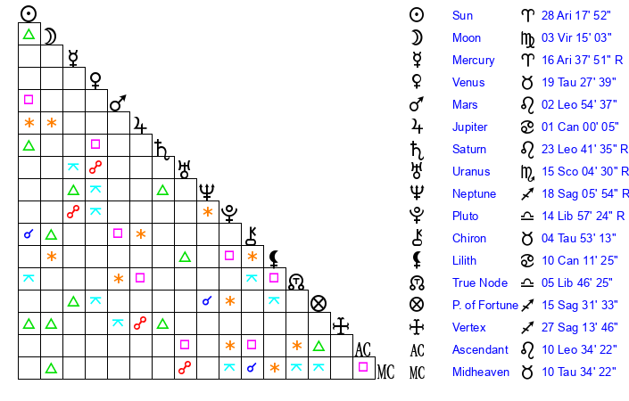 | Sun | 28 Aries 18 | 28 Aries 54 | 13 Gemini 43 |