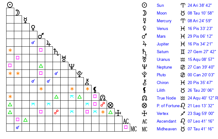 | Sun | 24 Aries 38 | 25 Aries 58 | 10 Leo 15 |
