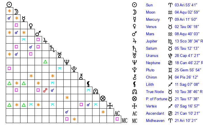 | Moon | 3 Aquarius 51 | 14 Aquarius 24 | 5 Aries 2 |