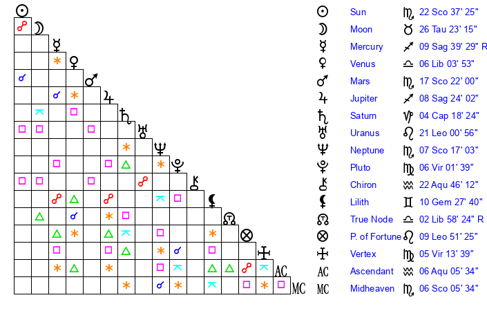 Moon | 26 Taurus 21 | 21 Taurus 54 | 5 Libra 19 |