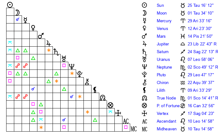 Moon | 1 Taurus 34 | 10 Capricorn 19 | 17 Libra 3 |