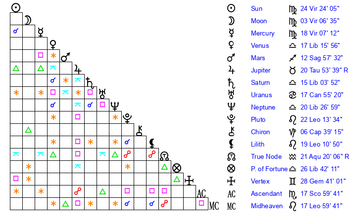 Sun | 24 Virgo 24 | 24 Virgo 44 | 7 Sagittarius 6 |