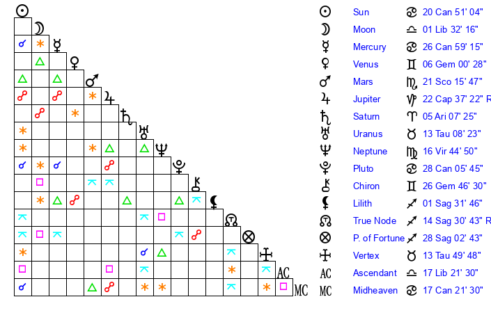| Moon | 1 Libra 44 | 26 Aquarius 16 | 13 Sagittarius 57 |