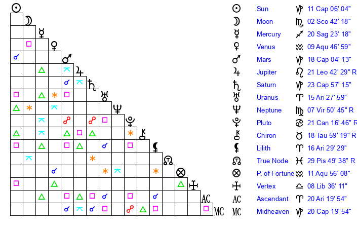 | Venus | 9 Aquarius 47 | 11 Capricorn 21 | 0 Gemini 44 |