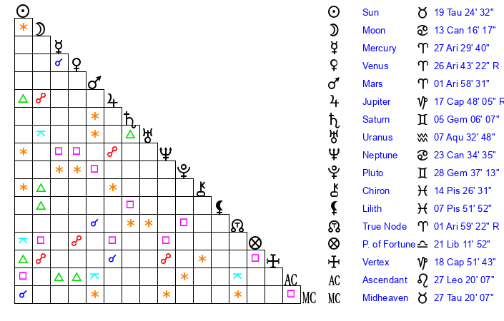 | Mercury | 27 Aries 30 | 0 Taurus 20 | 21 Leo 29 |