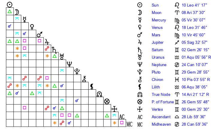 | Sun | 10 Leo 41 | 11 Leo 21 | 1 Sagittarius 48 |