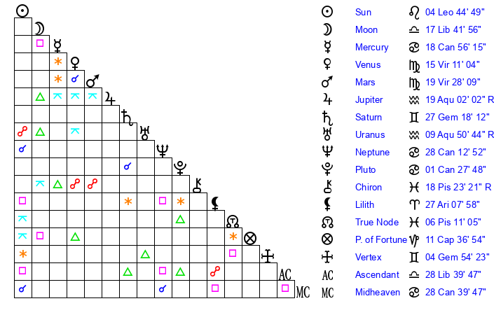 | Mercury | 18 Cancer 56 | 11 Leo 24 | 6 Scorpio 58 |
