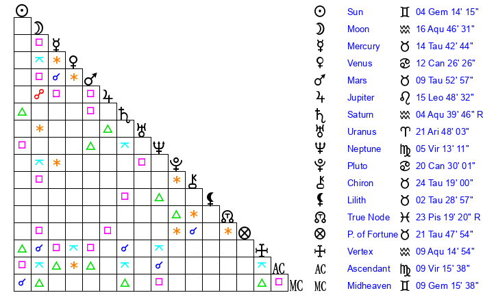 | Moon | 16 Aquarius 51 | 14 Taurus 43 | 29 Gemini 59 |
