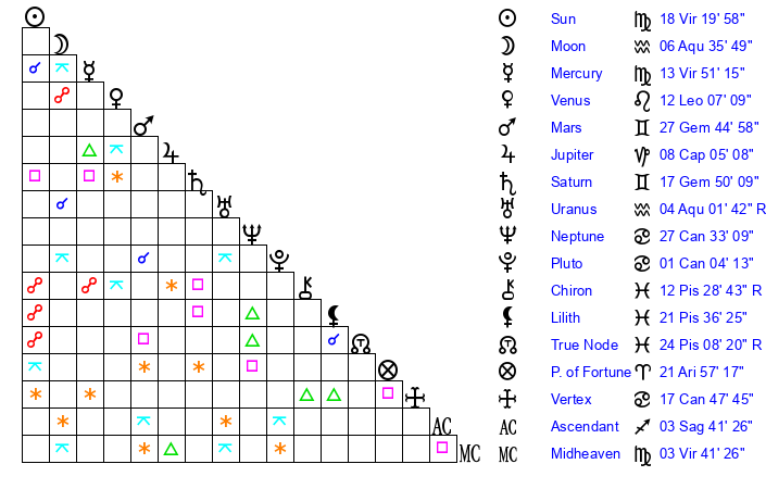 | Sun | 18 Virgo 20 | 19 Virgo 12 | 10 Capricorn 28 |