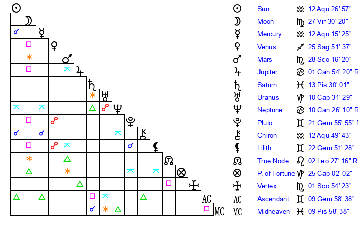 | Sun | 12 Aquarius 27 | 13 Aquarius 50 | 8 Gemini 49 |