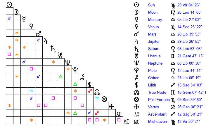 | Sun | 29 Virgo 5 | 29 Virgo 56 | 18 Sagittarius 3 |