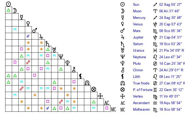 | Moon | 6 Aries 32 | 3 Aquarius 30 | 22 Scorpio 33 |