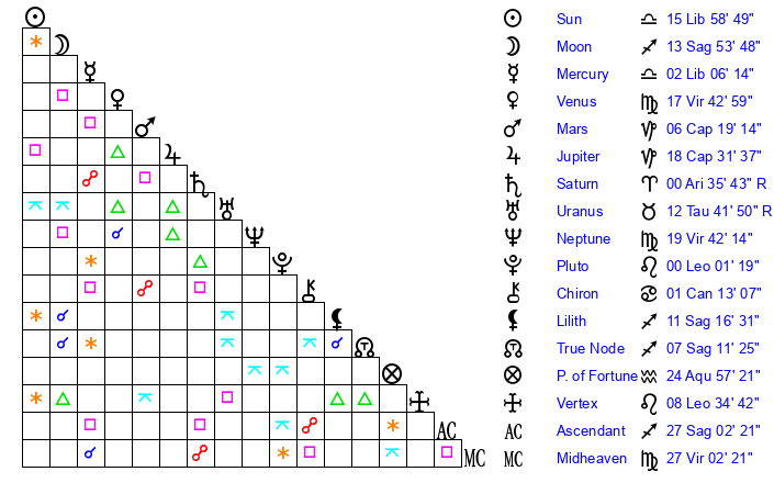 | Neptune | 19 Virgo 42 | 0 Aries 18 | 21 Virgo 6 |