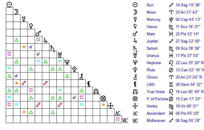 | Sun | 14 Sagittarius 20 | 14 Sagittarius 49 | 26 Pisces 36 |