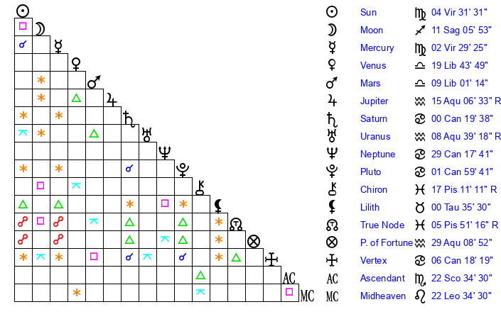| Sun | 4 Virgo 31 | 5 Virgo 38 | 24 Sagittarius 56 |