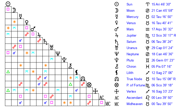 | Sun | 15 Aries 47 | 17 Aries 8 | 5 Leo 26 |