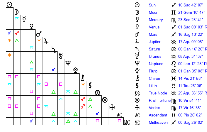 | Sun | 10 Sagittarius 42 | 11 Sagittarius 47 | 2 Aries 58 |