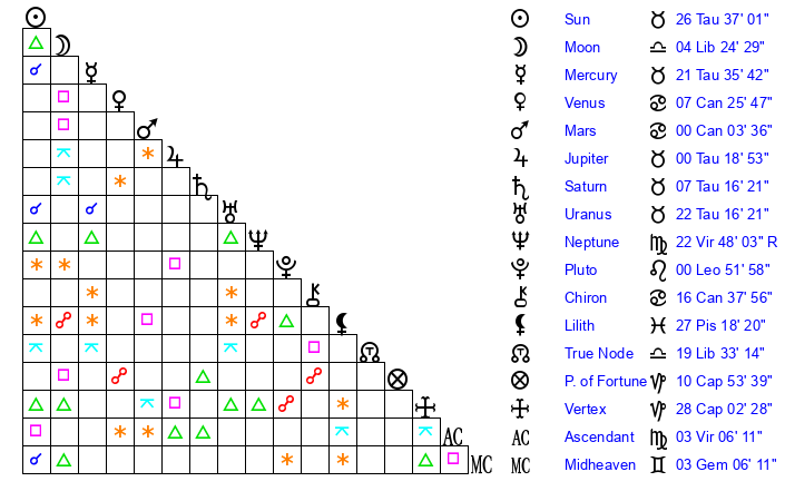 | Sun | 26 Taurus 37 | 27 Taurus 2 | 17 Leo 53 |