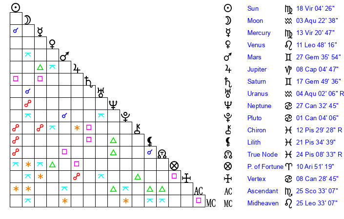 | Mercury | 13 Virgo 21 | 17 Virgo 7 | 26 Sagittarius 25 |
