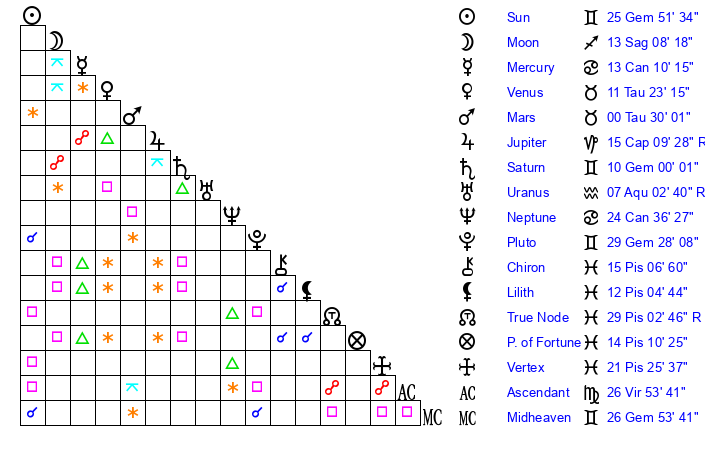 | Sun | 25 Gemini 51 | 26 Gemini 45 | 13 Libra 49 |