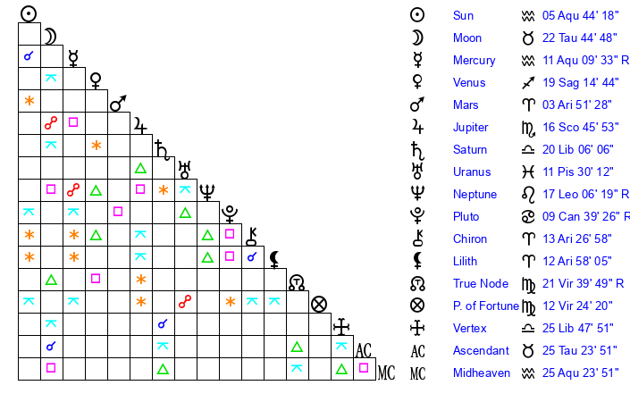 | Sun | 5 Aquarius 44 | 7 Aquarius 0 | 17 Taurus 4 |