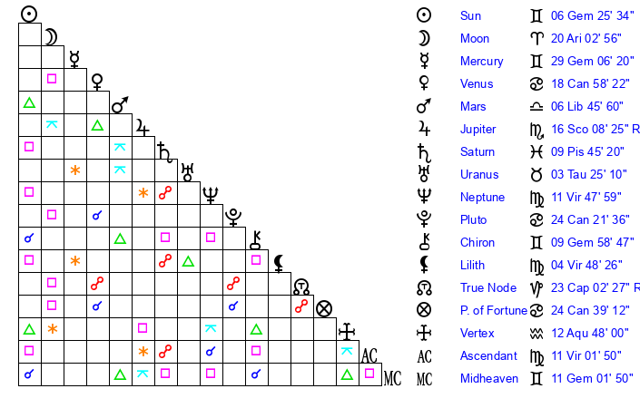 | Mercury | 29 Gemini 6 | 5 Gemini 48 | 17 Virgo 41 |