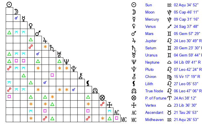 | Saturn | 20 Gemini 44 | 16 Pisces 29 | 22 Gemini 29 |