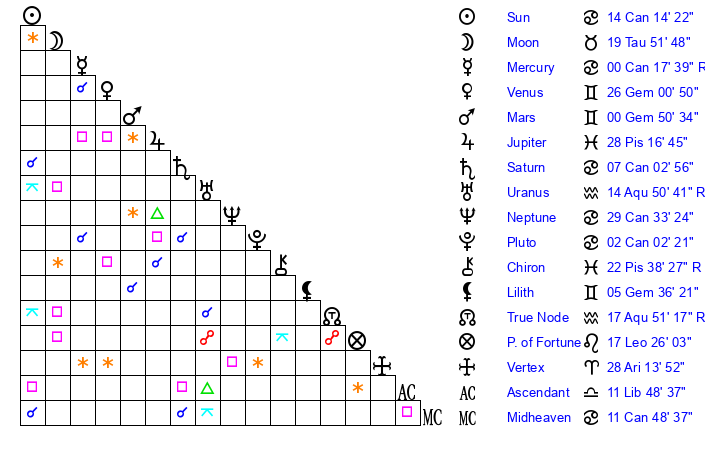 | Neptune | 29 Cancer 34 | 2 Aries 10 | 2 Leo 39 |