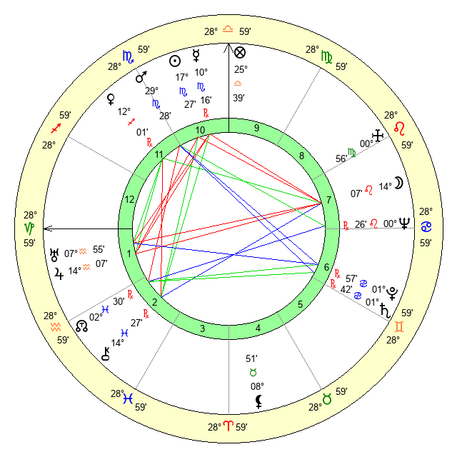 | Moon | 14 Leo 6 | 29 Cancer 33 | 9 Virgo 13 |