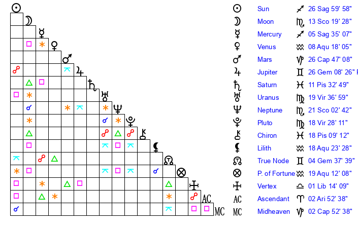 | Neptune | 21 Scorpio 3 | 27 Pisces 9 | 22 Scorpio 10 |