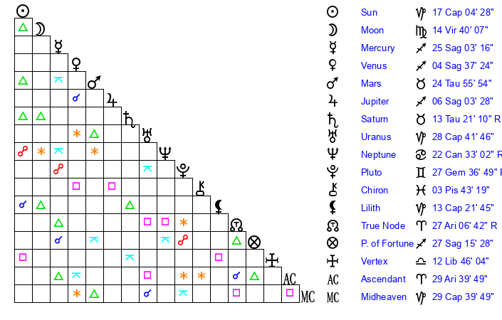 | Uranus | 28 Capricorn 40 | 27 Taurus 46 | 3 Aquarius 25 |