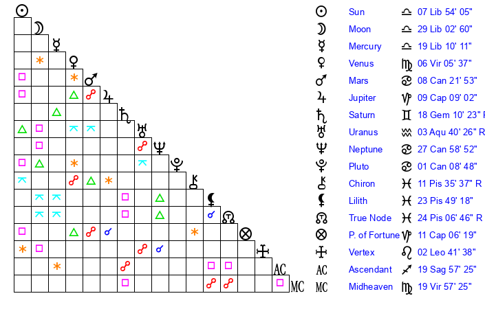 | Moon | 29 Libra 0 | 28 Capricorn 27 | 5 Sagittarius 19 |