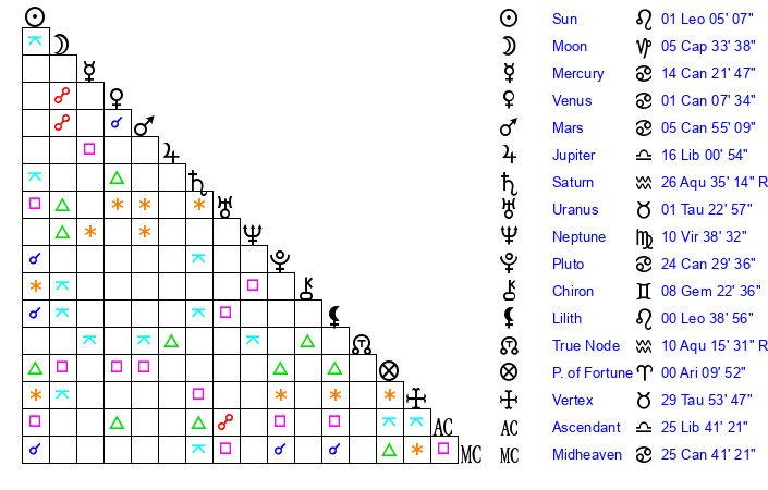 | Pluto | 24 Cancer 29 | 2 Aquarius 35 | 26 Cancer 4 |