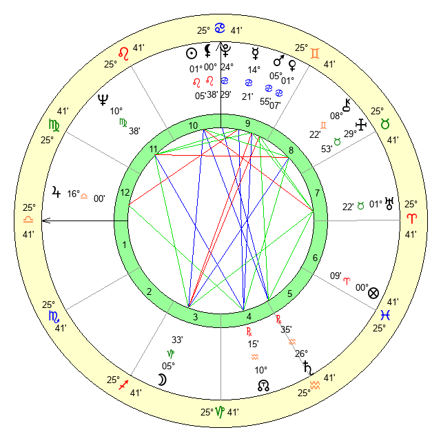 | Mercury | 14 Cancer 21 | 13 Leo 53 | 18 Scorpio 49 |