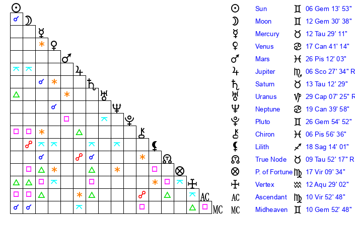| Sun | 6 Gemini 14 | 7 Gemini 37 | 25 Virgo 37 |