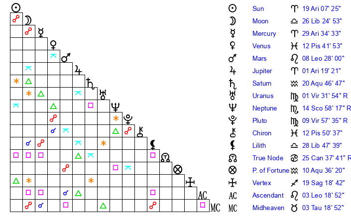 | Neptune | 14 Scorpio 57 | 0 Aries 22 | 13 Scorpio 22 |