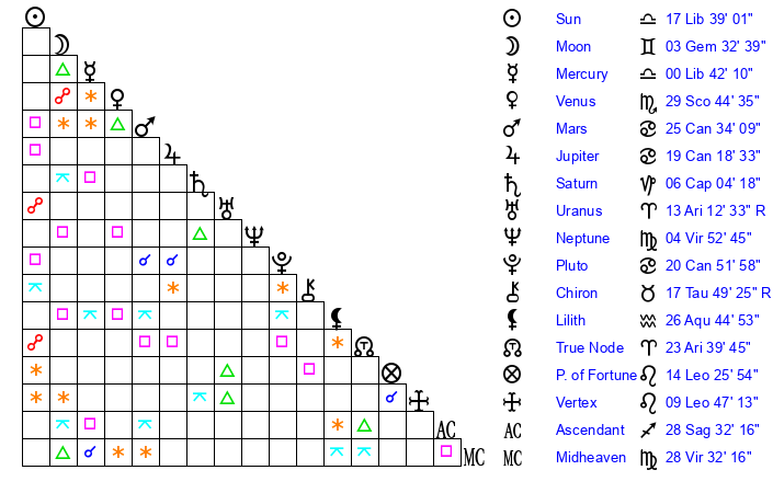 | Sun | 17 Libra 39 | 18 Libra 38 | 23 Capricorn 35 |