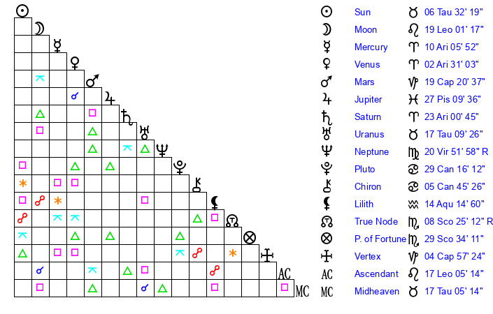 | Moon | 19 Leo 8 | 6 Taurus 15 | 19 Libra 15 |